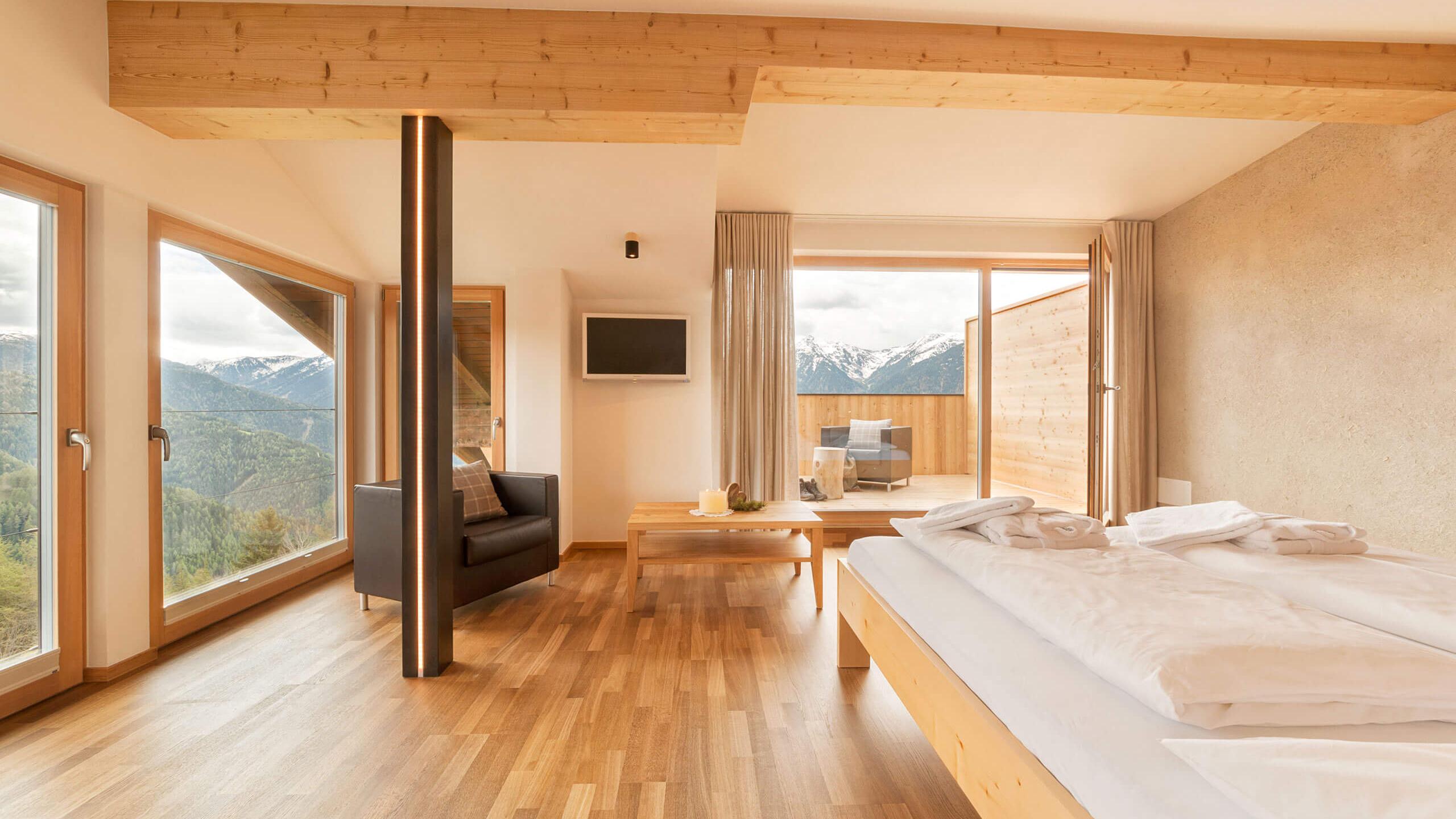 Le nostre suite a due piani sono il tempio del relax! L’arredamento in legno di quercia e cirmolo diffonde un soave profumo naturale. I muri in argilla e fieno del nostro maso garantiscono un soggiorno dallo stile unico. Due camere doppie separate offrono inoltre tutto lo spazio necessario per accogliere quattro persone. Il bagno è dotato di doccia e WC. L’ampia terrazza rivolta a sud offre tutto lo spazio necessario per godersi il calore dei raggi del sole. La suite Herol è un paradiso dal quale non vorrete più andare via! Vi ricordiamo, infine, che il prezzo della suite si riferirà a quello di tre persone anche quando saranno effettivamente due a occuparla.